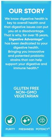 DAILY PROBIOTICS FOR WOMEN & MEN: Digestive Advantage Daily Probiotics + Intensive Bowel Support IBS supplement with 3 Digestive Enzymes are crafted to help support your digestive health and immune health.* DIGESTIVE HEALTH: Our probiotics for gut health help with immune health and occasional bloating & abdominal discomfort.* DIGESTIVE ENZYMES FOR WOMEN & MEN: Our Digestive Advantage Daily Probiotic + Intensive Bowel Support contains 3 digestive enzymes, Protease, Amylase, and Lipase. With 1 Billion CFUs of Probiotics to help support your overall digestive health.* HUNDRED TIMES BETTER: 1 Billion CFUs of patented BC-30 probiotics survives stomach acid 100X BETTER vs. yogurt. Based on median survivability of Digestive Advantage Probiotic BC30 vs. yogurts in a simulated gastric environment. BETTER THAN 50 BILLION: Our BC-30 Probiotics survive better than products offering 50 Billion live cultures. PATENTED MEN & WOMEN PROBIOTIC: Our probiotic strain is protected with a natural protein shell to deliver more beneficial bacteria to your gut alive, to support gut health for women and men.* TRUSTWORTHY INGREDIENTS: These probiotic intensive bowel support capsules are Non-GMO & Vegetarian. Digestive Advantage products are guaranteed for freshness, purity, and labeled potency. 96 Day Supply.