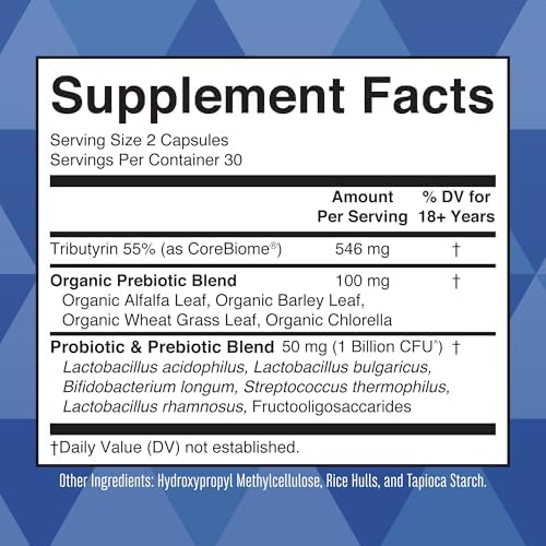 Hippocrates, dubbed the Father of Medicine, is quoted as saying “All disease begins in the gut,” and modern medicine agrees that the importance of gut health should not be underestimated! Our GI tract is the largest endocrine, or hormone producing, organ in the body and is estimated to house about 70% of the body’s immune cells. With our Complete Gut Health+ Capsules you can help provide for your gastrointestinal needs with this pre, pro, and postbiotic, all in one! Encapsulated in vegan capsules sourced from pine trees is a blend of butyrate (found here in Tributyrin (as Corebiome)), an organic prebiotic blend, and a probiotic blend, with 5 different probiotic strains! Butyrate is a short-chain fatty acid (SCFA) that is produced by microbial fermentation in the lower intestines from undigested portions of vegetables (fiber), and butyrate is particularly beneficial in maintaining the gut lining’s integrity. By supplying a prebiotic, introducing healthy bacteria to your gut with a probiotic, and providing the short-chain fatty acid butyrate, your gut receives beneficial components it needs to perform optimally, support immune function, and promote your overall health.