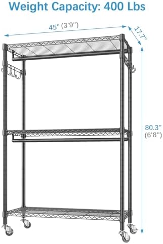 DIMENSIONS: 45"Lx17.7"Wx80.3"H (Overall with wheels). Weight Capacity: Total 400lbs (when not moving), 300lbs (when moving). LOCKABLE 360° WHEELS: Equipped with 4 rolling wheels, 2 of them are locking wheels, designed to allow you to roll this clothing garment rack where ever you need in home. ADJUSTABLE SHELVES: 3 Tiers clothes racks, 2 hanging rods and 2 sets of side hooks offers you various storage area. The shelves can be adjusted up and down for your needs to store difference sized items. Easily maximize your storage space by providing shoes storage, hang storage, folded storage. STURDY & RELIABLE: Made of high quality iron pipe, and powder-coated to protect it from water and rust, makes it stable, sturdy and reliable. Fit for bedroom, cloakroom, clothing store, laundry room, studio, sewing area, walk-in closet and more. EASY TO ASSEMBLE: A rubber mallet is recommended, but it's not included. Just be sure to read the assembly directions carefully BEFORE you start putting it together. Certain shelves must be installed in a particular order.
