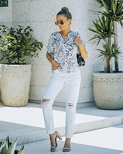 ANCAPELION Women’s Summer Chiffon Blouse Casual Short Sleeve V Neck Shirt Loose Printed Cuffed Sleeve Tunic Tops for Women