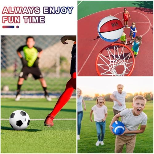 Package Sent to You: you will receive 1 piece of soccer, 1 piece of basketball, 1 piece of mini football with 1 piece of pump; The sufficient quantity can satisfy your various replacement, sharing, and daily needs Official Size: the size 5 basketball for kids is about 27.5 inches in perimeter, the size 4 soccer is about 7.9inches/ 20 cm and the size 6 football is about 10 inches in length and 18 inches in its widest circumference, suitable size for youth training, games and competitions Durable and Soft: you can use these kids sports balls indoors and outdoors, such as hard ground without grass, wet and grassy ground, and many other places suitable for exercise, even in the pool or on the beach, bringing a lot of fun to your daily life Easy to Carry: these sports balls are equipped with an air pump and air needle, which can be inflated and deflated whenever and wherever; Besides, they are easy to carry, so you can put them in your backpack and go to the playground or gym with your fellows Serve You Long: these toddler sports toys are made of thickened PU material, with nice flexibility, elasticity and stability, firm and not easy to deflate; And the foam coating cushions' design can prolong its service time