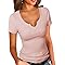PALINDA Women's Notch V Scoop Neck Ribbed Fitted Shirt Basic Short Sleeves Tee Shirt Top