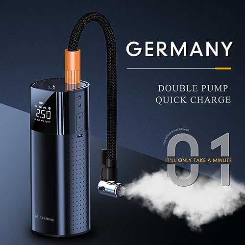 Powerful and Portable: The Minketerss air pump is a compact device that delivers up to 120 PSI, measures 6.1*2.2*2.2 inches, and is lightweight. With its compact and lightweight design, you can easily store it in your pocket, backpack or car without taking up too much space. Fast and Efficient: equipped with a high-performance chip, this air compressor delivers 25 liters/minute of airflow and can boost tire pressure from 22bra to 25bra in just 1 minute. It also features a rechargeable 2*2500mAh battery that allows the portable tire inflator to operate continuously for 30 minutes without external power. Just charge it for 2.5 hours and you are ready to use. Suitable for cars , motorcycles, bikes and balls. Easy to use smart mode: 4+N smart mode makes it easy to operate for beginners, while the manual mode allows you to set the desired pressure for different inflators. The digital display shows precise air pressure, and air pump will automatically shut off when reaching the preset value to avoid over-inflating. Safe and Beautiful: this air compressor can work continuously without stopping thanks to a high-performance turbo fan and an aerospace alloy body with good heat dissipation. The upgraded air hose is more resistant to high temperatures and easy to operate. More than a tire Pump: In addition to inflating tires, this 3-in-1 tire inflator also features a 3-mode LED light for emergencies, a Type-C charging port, and a 5V/2A USB output port for charging electronic devices.The Minketerss Portable Air Compressor is your all-in-one solution for tire inflation and emergency situations. Get yours today and experience the power and convenience of this amazing device!