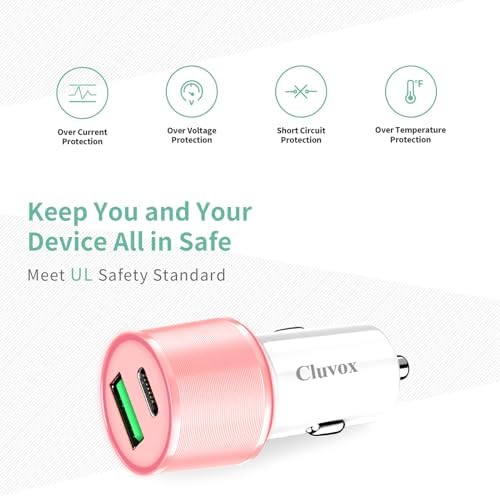 Pay For One Car Charger: You will get 2 car chargers, one for daily use, and one for as a backup, you can say goodbye to worrying that your phone won't charge during a car trip 35W Fast Car Charger: 20W USB C port + 15W USB A port, 4X faster than standard 5W chargers, fast charge iPhone 14 from 0% to 60% in 30 mins Simultaneously Charging Quickly: Dual rapid charging port car charger can fast charge two devices at the same time, Charge immediately without waiting One For All: Cluvox USB C car charger is compatible for iPhone 14 Plus/Pro/ Max/13 Pro/13/12/11/XS/Max/XR/X/8/SE 2020, Samsung Galaxy S22/S21/S20 series, Google Pixel 7/6/5 and more Keep You & Your Device All In Safe: A 12v car charger built-in protection system against over-current, over-charging, over-heating ensures superior performance, safety, and reliability