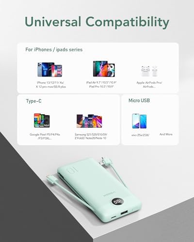 【Portable Charger with Built in Cables &Plug】 VEGER 10000mAh Portable Charger, with built-in USB-C , other cable for iPhone, and a Wall Plug for recharging the power bank itself, you can say goodbye to carrying adapters and cables when travel. 【Portable Charger for Multiple Devices】Designed for multiple devices, this portable charger features 4 outputs, including 2 cable outputs, USB-C, and USB-A outputs. Charge up to 4 devices simultaneously, and enjoy fast charging speeds of up to 15W with each cable and USB port output. 【10000mAh Capacity with Slim Body】: With a slim size of 5.9 x 2.7 x 0.72 inch size, 8oz weight, the external battery is a perfect travel accessory. Full 10000mAh Capacity is enough for daily used, which provides charges 1.8 for iPhone15/14, 1.6 charges for Samsung S23. 【Wide Compatibility】VEGER portable battery charger is widely compatible with All iPhone, iPad, Samsung, Google Pixel, tablets, just connected to your device with the cable built in and the external battery would fix with different devices to get fastest charging. 【What You will Get】: A VEGER 10000mAh portable charger with built in cables, 1x user manual, our worry-free 12 month guarantee and 7 Day/24H friendly customer service. If you have any problems, please contact us and we will solve it within 12 hours.