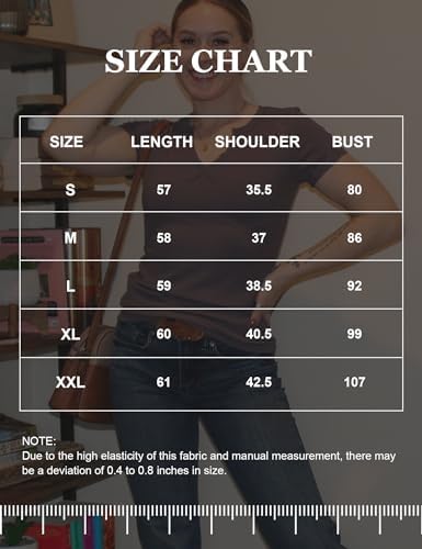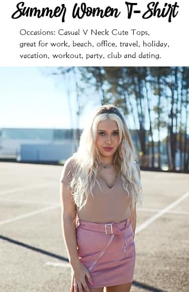 Soft material:This basic short sleeve shirt adopting high cotton content fabric and the fabrics ensures that it does not iritate your skin. The fabric is quite soft, and is the perfect thickness/thinness for all seasons Trendy design:The neckline with the little dip into the decolletage makes this otherwise standard top a bit special.It wasn't too low-cut, but just right. This hangs will well on your body and is an overall nice fit, with the ribbing being an added bonus Matching:It's comfortable and very versatile to dress up or down.It is easy to get many compliments when you paired with jeans,skirts,shorts,leggings for a casual look, or wear it with a denim jacket, cardigan and so on Various occasions:Suitable for daily wear, work, beach, office, travel, holiday, vacation, workout, party, club and dating etc.This v neck top is suitable for any season and the slim silhouette gives a flattering fitted look Size note:Please check the size chart in our product description before purchasing. Due to manual measurement,the size may have a deviation of 1-2cm, please understand