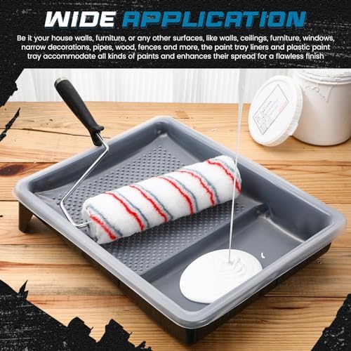 A Comprehensive 9 Inch Painting Tray Kit: this paint roller tray set gears up your painting task to precision; The pack contains 1 paint roller tray, 48 disposable paint tray liners, and 1 paint roller frame; Ideal for all your wall painting needs, this paint kit for house painting assures completeness in every aspect, making it a lucrative buy for every painting enthusiast Suitable Size Compatibility: sized accurately, the paint roller tray measures about 14.17 x 10.24 x 2.36 inches, whereas the tray liners stand at 15 x 11.8 x 2.4 inches; The paint roller frame comes at 8.98 x 11.81 inches; All components properly fit each other, making these paint trays especially handy when using a 9 inch paint roller Built to Last: made of sturdy plastic, the paint roller tray and paint tray liner promise prolonged durability; The reliable paint roller frame further withstands the demands of any painting task; This paint roller set is sturdy and ensures reliability for all your painting endeavors Design for Efficiency: the paint roller tray set features a deep paint pocket and textured ridges design to maximize your paint pickup and release; Equipped with sturdy and stable legs, the tray stays well balanced to prevent any spills, making it a valuable addition to your wall painting kit Versatile Application: this paint roller tray set proves fruitful for a range of painting applications; Be it your house walls, furniture, or any other surfaces, like walls, ceilings, furniture, windows, narrow decorations, pipes, wood, fences and more, the paint tray liners and plastic paint tray accommodate all kinds of paints and enhances their spread for a flawless finish