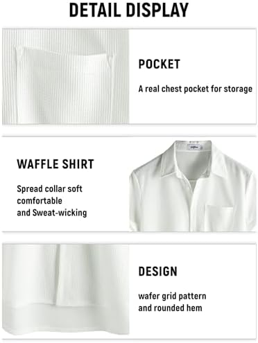 Garment care: Hand wash or machine wash at room temperature, do not bleach. Premium Fabric: This lightweight waffle shirt is made of soft and comfortable fabric with high breathability as well as sweat-wicking, which provides breathability and coolness even in summer. Stylish Design: The classic wafer grid pattern and rounded hem, adding a stylish and sophisticated touch to your outfit. The single pocket on the front of the lapel collared shirt adds convenience and functionality to store small items. Occasion: Perfect for travel, dating, streetwear,camp,workout, outdoor, wedding, school, beach, party, vacation, business and etc. Ribbed shirt is a great choice as a present for your friends, boyfrend, or father. Match: Mens hawaiian shirts can be matched with various styles of trousers and shoes, suitable for all occasions. It is a must-have piece for any man's wardrobe.