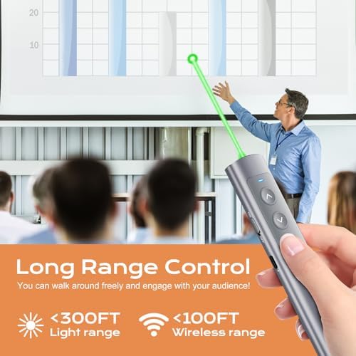 [Plug&Play]: This PowerPoint clicker does not need to install any software--just simply plug the receiver into your computer's USB port, and then start your presentation. [Rechargeable Computer Clicker]: 200mAh rechargeable battery supports weeks of use and avoids the hassle of replacing the battery. Powerful rechargeable ppt clicker gives a good presenting experience! [wireless clicker]: With its long-distance control microchip allows you to move along the room. Bright green laser (<5mW 3a) highlights key parts of a presentation, creating great interaction with your student/audience. It is also a funny toy for your cats & dogs with its bright light. [Handy Design]: The bottom magnetic USB dongle storage design prevents your USB receiver from being lost. Clicker for PowerPoint presentations is perfect to fit your hand or backpack. [Widely Compatible]: USB A/Type-C 2 in 1 wireless presentation clicker meets your needs of diverse choices,never worry about the interface issue. Presenter clicker supports the following operating system:Windows,Mac OS, Linux, etc. Our power point slide clicker is a good tool for teachers or professionals!