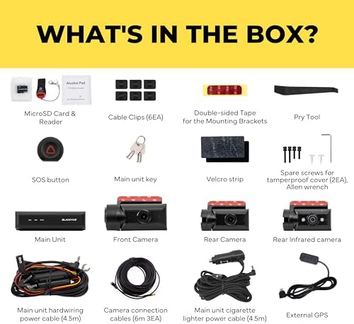 [3-channel Full HD dashcam] Powered by back-illuminated STARVIS image sensors, the 3 compact cameras (Front+Rear+Interior) capture clear details in both shadow and highlights thanks to high sensitivity and wide dynamic range. [Ultrawide infrared interior camera] With its 180-degree view angle, the infrared camera secures the vehicle’s interior--from driver to passenger side--with spectacular clarity day and night, and gives peace of mind to taxi and rideshare drivers. [Separate Recording Unit and Wireless Button] Unlike conventional dashcams, the microSD card is stored in a separate "Box" recording unit that acts as the main hub and can be stored in a safe location (under seat, in glove compartment, etc.), for maximum stealth and security. Press the wireless “SOS” button to trigger manual Event recordings, with a 10-second pre-Event buffer. [Stealthy Design] The modular box design allows for smaller, low-profile cameras, including the front camera. [Heat Resistant] Standard dashcams have their processor in the front cam, which can run hot in the sun. Easily avoid overheating by placing the box in a cooler location of your vehicle. [Native Parking Mode] When hardwired to the vehicle’s fuse panel, Parking Mode activates automatically when vehicle ignition is turned off. Voltage cutoff and timer can be set in the BlackVue App. [Cigarette Lighter Adapter + Hardwiring Cable included] With the Cigarette Lighter Power Cable, easily connect the dash cam to your vehicle’s 12V auxiliary power socket. With the Hardwiring Cable, connect the dash cam to your vehicle’s fuse panel to take advantage of the built-in Parking Mode feature.