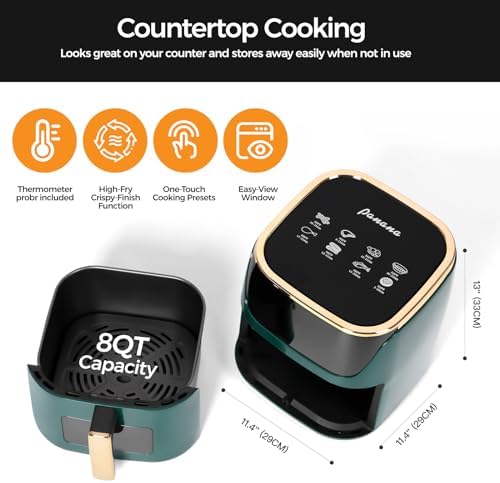 Generous 8-Quart Capacity: Perfect for families, this air fryer can prepare large portions in one go, making it ideal for gatherings or meal prepping. 8 Preset Cooking Menus: Enjoy effortless cooking with one-touch presets for popular dishes like fries, chicken, seafood, and more—catering to various cravings. User-Friendly Digital Touchscreen: The intuitive touchscreen display allows for easy temperature and time adjustments, putting precise control at your fingertips. Nonstick, Dishwasher-Safe Basket: The removable nonstick basket ensures easy cleanup, while its dishwasher-safe design saves you time and effort in the kitchen. Compact and Stylish Design: Despite its large capacity, the compact footprint fits well on any countertop, combining practicality with a sleek, modern look.