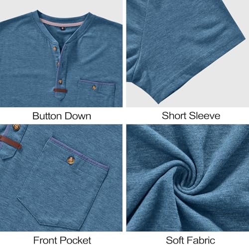 Henley Material: The men's henley shirts are made from high quality fabirc fabric,lightweight, soft, and breathable, perfect for the summer months. Stylish Design:This mens casual short sleeve henley shirts featuring a 3 buttons placket,collar contrasting color design, and a front pocket,both casual and classic, ideal for everyday wear. Durable Quality: These men's casual pocket t shirts are stretchy, comfy, and skin-friendly, making them suitable for various activities such as work, sports, and holidays. Versatile Wear: Whether you're heading to work, hitting the beach, or lounging at home, this summer tee shirts are a wardrobe essential. Pair this henley t shirts with jeans or shorts for a stylish look. Note: Machine Washable,Not easily shrunk and deformed,US Size. Please carefully refer to size chart before ordering the men's fashion henley pocket tops.