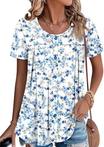 Features: Solid color, butterflies, heart, geometric pattern, tie dye, Boho Paisley print or floral print, round neck, short sleeve, front pleat with 5 decorative buttons. 3 blouse styles to choose from. Bright colors and loose design. Women of all sizes can easily pull off fitted shirts. Fabric: Solid-color tunic tops are made of 35%COTTON,60%POLYESTER,5%SPANDEX, printed shirts are made of 95%POLYESTER,5%SPANDEX. Comfortable and soft fabric with elastic, lightweight and skin-friendly, breathable and cool material for summer. Match: Women's short sleeve tops come in a variety of of styles, and can be paired with shorts, skirts, slacks, jeans, sneakers and heels for a trendy casual look. It is an essential item in the wardrobe of women and girls. Occasion: Suitable for everyday wear in spring, summer and fall. It is a great choice for dating, street, shopping, office, school, home, weekend dinners, parties, holidays, travel, outdoor sports and any other occasion. Attention: Please refer to our brand size chart and select your fit size according to it.(NOT AMAZON SIZE CHART).