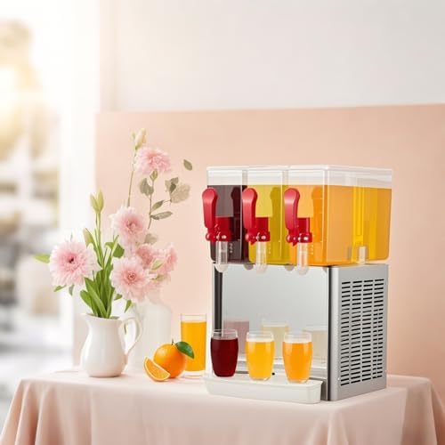 10L Large Capacity per Tank: Each tank of this commercial beverage dispenser holds 10 liters (approximately 2.6 gallons), making it ideal for high-volume serving in restaurants, bars, cafes, and catering services. Its three-tank design allows you to serve multiple beverages simultaneously, enhancing efficiency during busy hours. Built-in Mixer and Infuser for Customizable Drinks: Equipped with a powerful mixer and infuser, this juice dispenser ensures consistent blending and infusion of flavors. Create refreshing beverages like infused water, iced tea, fruit juices, or cocktails with ease, offering your customers a unique and customizable drink experience. Refrigerated System with Thermostat Control: Keep your beverages cold and fresh with the built-in refrigeration system. The adjustable thermostat control allows you to maintain the perfect temperature for different drinks, ensuring optimal taste and quality for every serving. Premium Stainless Steel Construction: Made from durable, food-grade stainless steel, this dispenser is built to withstand the demands of commercial use. Its sleek, professional design not only enhances the aesthetics of your space but also ensures easy cleaning and long-lasting durability. Integrated Ice Tub for Extended Cooling: The included ice tub helps keep your drinks chilled without diluting their flavor. This feature is perfect for serving cold beverages like iced coffee, smoothies, or cocktails, ensuring a refreshing experience for your customers even during extended service periods.